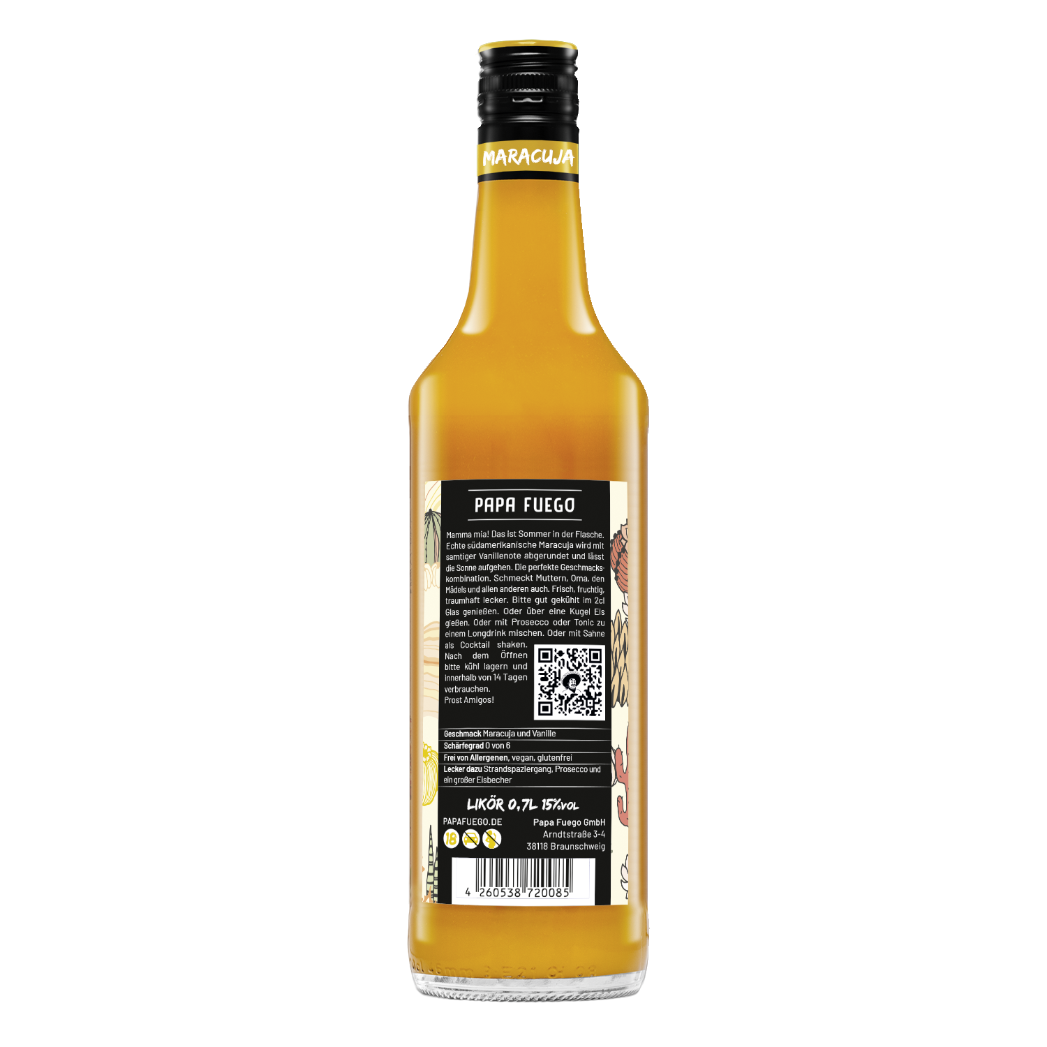 Süß, fruchtig, samtig. Der Maracuja Vanille Likör von Papa Fuego ist wie Sommer in der Flasche. Was das Sommergetränk so lecker macht? Maracuja aus Ecuador wird veredelt mit feinstem Vanillegeschmack. Für das vegane und laktosefreie Getränk werden nur natürliche Zutaten und keine künstlichen Farbstoffe und geschmacksverstärkende Zusatzstoffe verwendet. Der Maracuja Drink ist mit 15 Vol.-% das ideale Partygetränk, sorgt auch als Gastgeschenk für fruchtige Erlebnisse auf jeder Party und ist als Schnaps zum Verschenken das perfekte Geschenk. Nach dem Öffnen sollte der Likör kühl gelagert und zügig aufgebraucht werden. Aber das macht ihr ja eh, denn leicht gekühlt als Maracuja Shot, als Longdrink auf Eis, als Cocktail Zutat oder als Topping für Eis und Desserts ist der fruchtige Likör unglaublich vielseitig und schneller leer, als euch lieb ist.